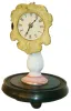 Candlestand clock, porcelain stand with pink band and striping at base, electroformed copper dial surround, Roman numeral white paper dial, steel spade hands, 30 hour timepiece movement, all under a glass dome and mounted to an ebonized, turned wooden