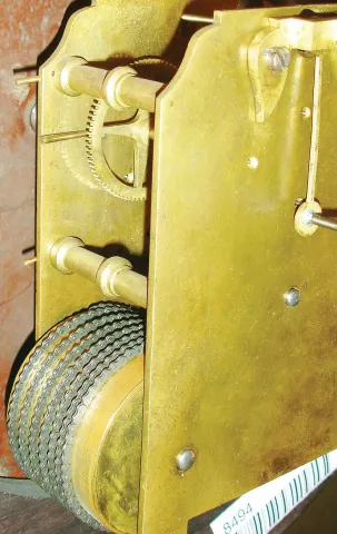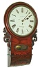 Mahogany veneered case in an old and possibly original finish with a small veneer piece missing and crazing and hairline cracks in the crotch veneer on the curved bottom. The bottom access door will need to be reattached. Original painted dial with some wear and minor paint loss at the mounting pillars. Hands are original. Nice chain drive fusee movement. Ht 27"