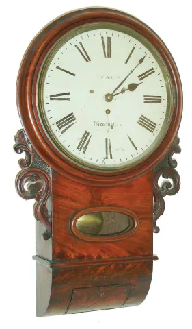 English, 8 day, brass fusee movement tavern wall clock or timepiece, c1875 Mahogany veneered case in an old and possibly original finish with a small veneer piece missing and crazing and hairline cracks in the crotch veneer on the curved bottom. The bottom access door will need to be reattached. Original painted dial with some wear and minor paint loss at the mounting pillars. Hands are original. Nice chain drive fusee movement. Ht 27"