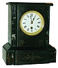 French black marble 8 day time only mantel clock, c1900 the stone case, with no damage or losses except very minor edge chips, has nice green marble accents. The black surface has dulled but some color remains in the incised patterns. The white porcelain dial has faint hairlines and some chips around the winding hole; the beveled glass is fine; the single train movement is unsigned. Ht 10.5"