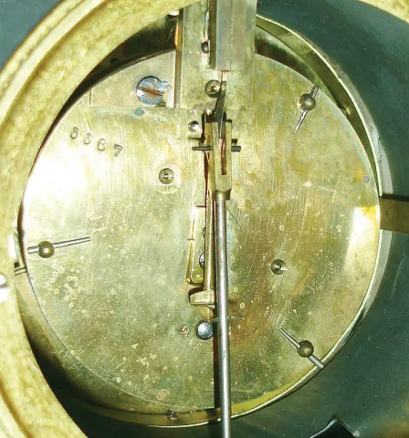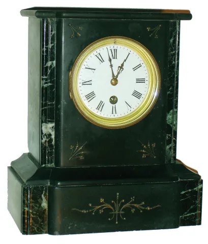 the stone case, with no damage or losses except very minor edge chips, has nice green marble accents. The black surface has dulled but some color remains in the incised patterns. The white porcelain dial has faint hairlines and some chips around the winding hole; the beveled glass is fine; the single train movement is unsigned. Ht 10.5"