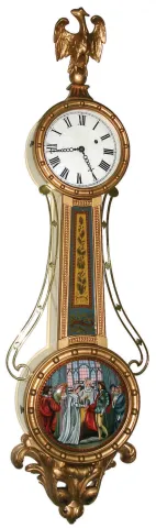 Girandole 8 day time only weight driven reproduction painted wood and glass banjo wall clock, c2000 this well made decorative case has thick wood carvings, brass side arms, and other features of the Curtis original, with the door latches showing lesser quality and some cream paint runs on the back panel.. The lower glass, with the titled "Marriage" theme, is signed "Moberg". The painted dial and proper hands are fine. The banjo style movement and weight are present, but the pendulum disk is absent (easily replaced). Ht 44"