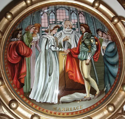 this well made decorative case has thick wood carvings, brass side arms, and other features of the Curtis original, with the door latches showing lesser quality and some cream paint runs on the back panel.. The lower glass, with the titled "Marriage" theme, is signed "Moberg". The painted dial and proper hands are fine. The banjo style movement and weight are present, but the pendulum disk is absent (easily replaced). Ht 44"