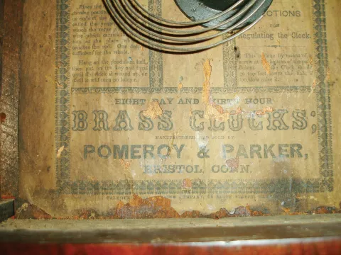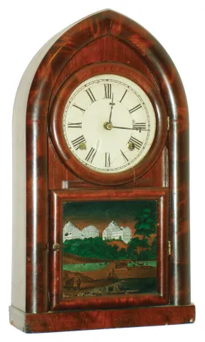 Pomeroy & Parker, Bristol, Conn., 8 day, time and strike round gothic or beehive shelf clock, c1852 Mahogany veneered case in original finish with some small veneer loss and repairs on the base. Upper door bezel has an age crack. Original painted dial with some minor loss at the mounting screws. Hands are original. Dial glass is cracked. Original decal tablet with some small loss on the bottom. Dark but readable label inside the case. Ht 18.5"