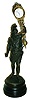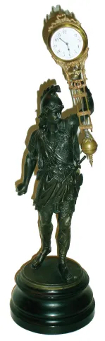 Swinger, bronzed cast metal classical soldier, on turned wood base, holding a German swinging clock, 20th century we do not see this model in catalogues or previous sales, and the Junghans style clock appears too small for the scale of the figure. The soldier is detailed and in good condition, although missing whatever he held in his right hand. The clock swings and ticks although we did not test it long-term, and its porcelain dial signed "Germany" has some hairlines. Ht to top of clock 20.25"