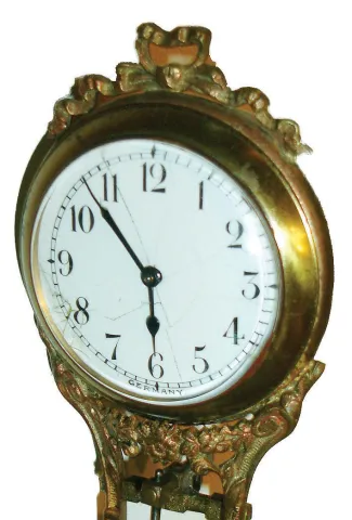 we do not see this model in catalogues or previous sales, and the Junghans style clock appears too small for the scale of the figure. The soldier is detailed and in good condition, although missing whatever he held in his right hand. The clock swings and ticks although we did not test it long-term, and its porcelain dial signed "Germany" has some hairlines. Ht to top of clock 20.25"