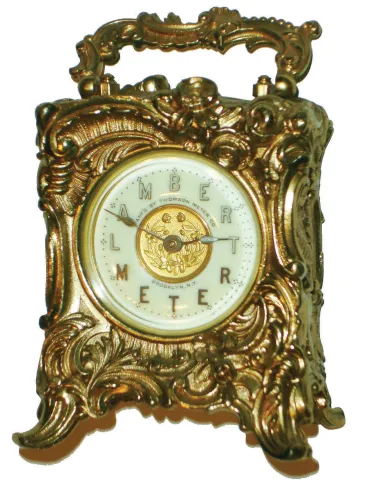 Thomson Meter Co., Brooklyn, N.Y., for Lambert Meter, cast brass time only 30 hour novelty advertising clock, dated 1901