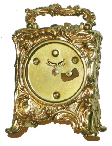this heavy ornate small case has been nicely polished, the round glass is beveled, and the advertising porcelain dial is pristine, although the hour hand needs to be straightened. An added bonus is the stamp on the bottom indicating "Souvenir of A.W.W.A. Convention, New York, 1901". Winds, ticks and sets. Ht 5.5"