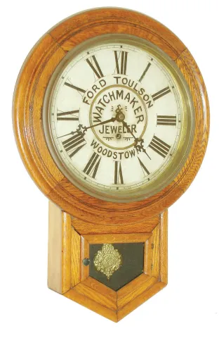 Waterbury Clock Co., Waterbury, Conn., short drop wall clock, 8 days, time only, spring driven movement in an oak case with advertising on painted metal dial "FORD TOULSON WATCHMAKER & JEWELER WOODSTOWN,", c1900