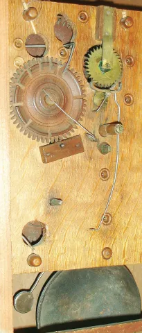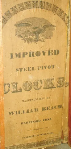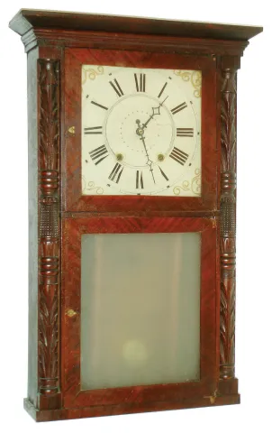 William Beach, Hartford, Conn., 30 hour, time and strike weight wood movement carved columns and cornice top shelf clock. c.1834