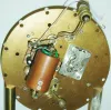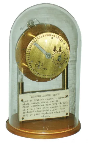 World War II "Delayed Arming Clock", naval mine timer on wood base under glass dome, c1940 a tag on the custom-made base explains the nefarious purpose of this timer, allowing mine detonation after minesweepers have passed. The balance staff is broken, and there is no obvious power source for the train, but still an interesting military horology artifact. Diameter of front brass dial is 3"; ht of dome on base is 8"