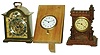 Clocks- 3 (Three) small desk clocks: Austrian castle-form wood 30 hour time only; Swiss Octava 15 jewel 8 day travel clock now in wood stand; Cortland Swiss modern small brass 8 day bracket clock time and alarm, 20th century
