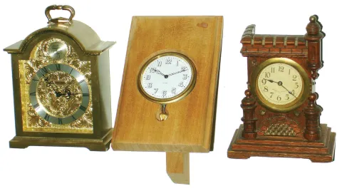 Clocks- 3 (Three) small desk clocks: Austrian castle-form wood 30 hour time only; Swiss Octava 15 jewel 8 day travel clock now in wood stand; Cortland Swiss modern small brass 8 day bracket clock time and alarm, 20th century the high quality heavy modern miniature bracket clock is in nearly new condition, but now ticks and stops, ht 6.25". The Austrian carved wood piece is detailed and interesting, with an average quality rear-wind movement, ht 6". The Octava, originally fit into a folding leather case, has a 3-adjustments movement, nice porcelain dial, and the new purpose-made 6.5" stand provides a nice display.