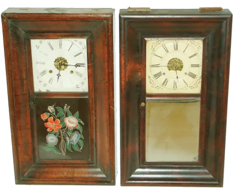 (1) Refinished rosewood veneered New Haven spring OG in very nice condition with original tablet and dial. Ht 18.5". (2) Mahogany veneered Chauncey...