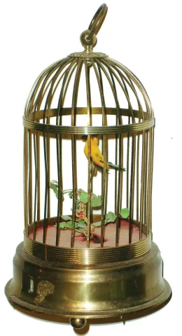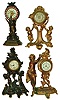 Clocks- 4 (Four) American cast metal 30 hour time only novelty clocks: New Haven, Jennings, Ansonia, unsigned; plus German singing bird in brass cage; early 20th century