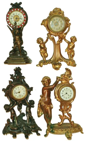 there are nice old patinas on all these figural cases, with some tarnish but no losses. The dials have minor toning. Three of the glasses are bevele...