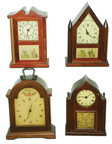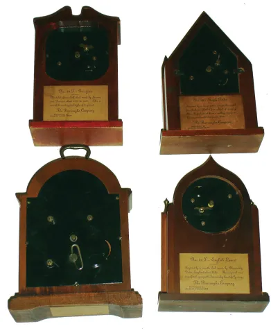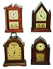 Clocks- 4 (Four) Burroughs miniature timepieces based on old designs: No. D61 Bracket 8 day; No. 48 T Georgian; No. 52 T English Lancet; No. 49 Steeple Gothic; c1930