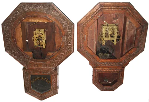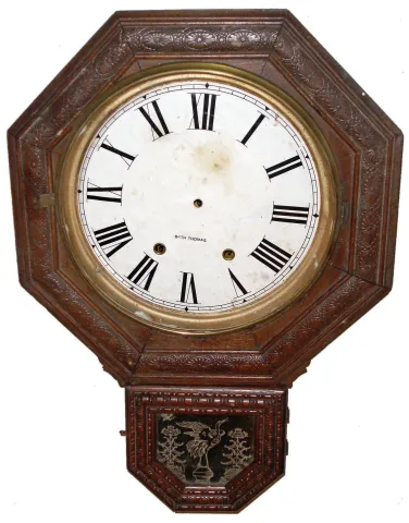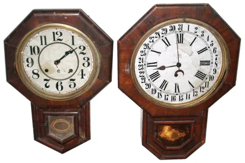Clocks- 5 (Five) Connecticut wood 8 day drop octagon hanging school clocks, late 19th century