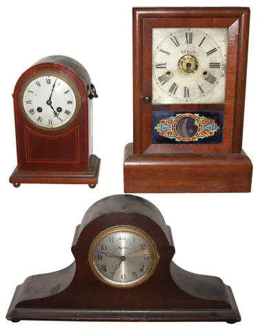 Clocks- 5 (Five) wood case time and strike mantel clocks: American, French, Asian