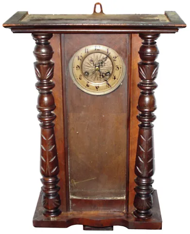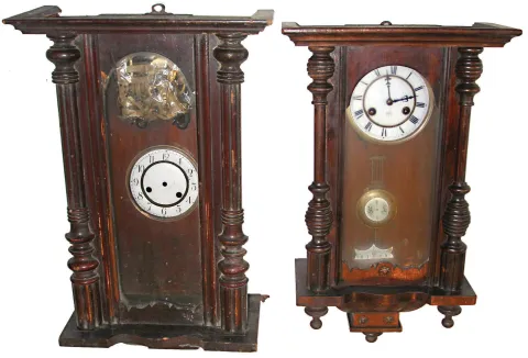 the carved and turned wood cases all include movements and dials, but may be missing pendulums, glasses, and some case parts. Two largest are weigh...
