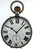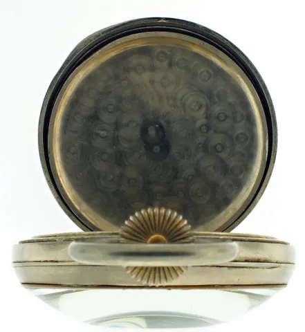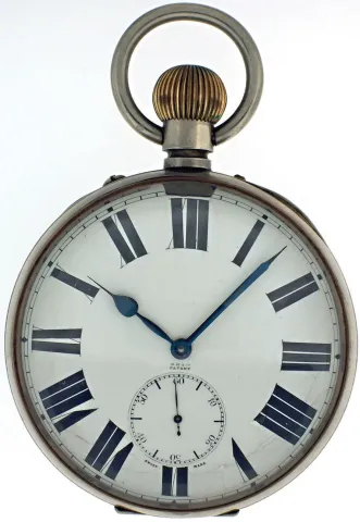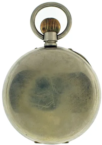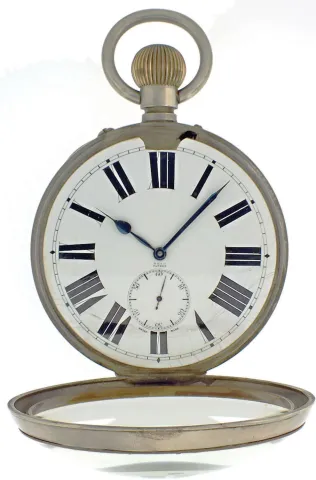 Switzerland, oversized pocket watch form desk clock, 8 day15 jewels, stem wind and pin set, gilt plate movement, with lever escapement, cut bimetallic balance, double roller and gold timing screws, in a nickel, hinged back and bezel open face case with thick convex glass magnifying crystal, with Roman numeral, single sunk white enamel dial, blued steel spade and poker hands, 103mm, c1910 CASE: Scratches on outer surface of case; Minor scratches on cuvette. DIAL: Numerous hairlines and spider hairlines; Filled chip in enamel at 4:00. HANDS: Good, with minor oxidation. MOVEMENT PLATES: A few minor scratches on plate; Winding wheels with specks of oxidation; Regulator with spots of rust; Some screws with minor oxidation. MOVEMENT FUNCTION: Running order (winds, sets and ticks).
