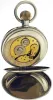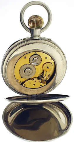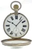 Switzerland, oversized pocket watch form desk clock, 8 day15 jewels, stem wind and pin set, gilt plate movement, with lever escapement, cut bimetallic balance, double roller and gold timing screws, in a nickel, hinged back and bezel open face case with