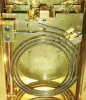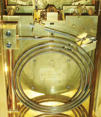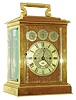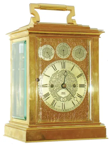 H. Pleister, 277 Regent St., London, giant carriage clock with perpetual calendar, large 8 day, two train fusee movement, gilt platform with spring detent escapement and free sprung cut bimetallic chronometer balance with blued helical spring, counting the hours on a large gong and with a single blow at the half hour, the back plate with small aperture for viewing seconds disk attached to contrate wheel arbor, silvered dial with gilt mask signed "Dent London", the day of the week, month, and date displayed on 3 small dials arranged above the time dial, blued steel Breguet style hands, narrow blued steel hands for the calendar functions, all contained in a polished, gilt brass case with carrying handle, with thick, beveled glass panels, Ht. 14 1/4" to top of handle, c1870 Case polished and regilded, minor marks and scratches, minor casting flaws, good glasses, dial and mask replaced and with spurious signature, hands may also be replaced, running well and striking correctly, calendar working