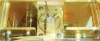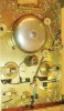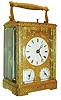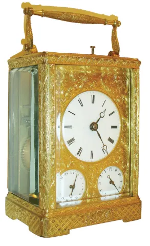 France, for the English market, carriage clock, gilt case and dial mask entirely covered with engraved ornament and set with beveled glasses, the turned handle also engraved, Roman numeral white enamel dial shows the time, above Arabic numeral dials for alarm and calendar displays, blued steel Breguet style hands, week going brass movement with engraved back plate, striking grand and petit sonnerie on two bells, the striking without dead blow between hours and quarters, lever for selection of strike mode on back plate, and with alarm and date, gilt lever platform with engraved balance cock and steel balance, center arbor with ratchet and click to prevent turning the hands backward, back plate marked 1846 15 12, c1850 case good, with wear, glasses with minor scratches, left and right glasses with chips on back, dial mask very good, time dial with significant spider hairlines below 11:00 - 12:00, alarm and date dials each with a hairline and minor flakes, time hands good, alarm and date hands replaced, movement running well, striking and repeating correctly, but striking occurs 3 - 4 minutes after the quarter, alarm train will need repair, exit pallet on hammer arbor broken, click springs with marks from wide screwdriver, knurled knob added to center arbor square for setting, could be removed, Ht 7 3/8" to top of handle