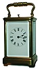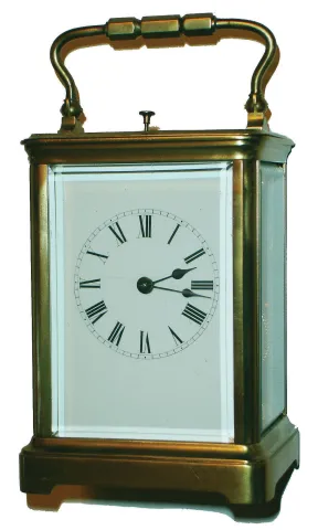 French brass and beveled glass 8 day time, strike and repeat carriage clock, c1900 the case is complete and intact, except for the bottom cover which often is absent, and the beveled glass panels are fine. The white porcelain dial has a horizontal hairline across the center. The silvered lever platform ticks briskly, and the strike and repeat appear to function properly. Ht to top of handle 7"