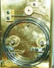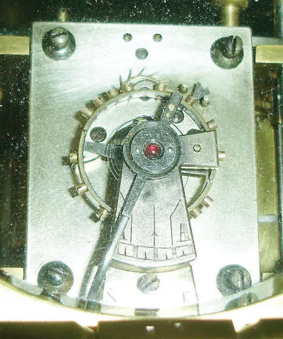 the case is complete and intact, except for the bottom cover which often is absent, and the beveled glass panels are fine. The white porcelain dial has a horizontal hairline across the center. The silvered lever platform ticks briskly, and the strike and repeat appear to function properly. Ht to top of handle 7"
