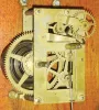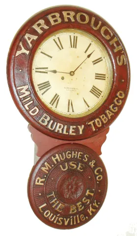 Baird Clock Co., Plattsburgh, NY, "Yarbrough's Mild Burley Tobacco" advertising wall clock, 8 days, time only, spring driven movement in wooden case with paper mache doors and paper dial, c1893 the bottom advertisement reads "R.M. HUGHES & CO. LOUISVILLE, KY.". The lower door is in excellent original condition. Advertising on top door has been touched up. The dial is original / old, with extra holes in pan / mounting area. This rare Yarbrough's model is not pictured in Jerry Maltz's "Baird Advertising Clocks". Ht 31"