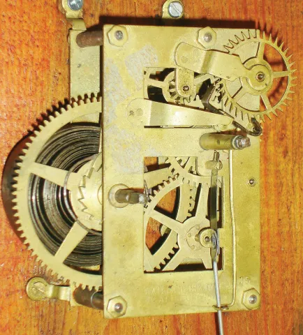 Baird Clock Co., Plattsburgh, NY, "Yarbrough's Mild Burley Tobacco" advertising wall clock, 8 days, time only, spring driven movement in wooden case with paper mache doors and paper dial, c1893