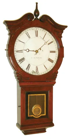the case has been refinished. There is a crack repair to the back board, the top finial photographed is a replacement, but we believe we have the original. The tie down for the pendulum is absent. The minute hand is a replacement. There are extra holes under the dial, which has some flaking. There are some losses to the lower tablet. The clock has a period Howard No. 70 weight. Ht 40"