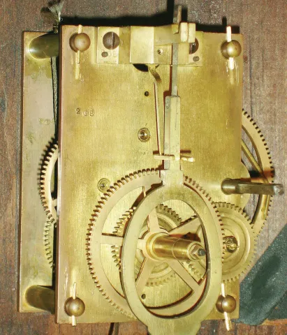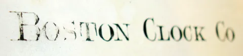 Boston Clock Co., Boston, Mass., wall regulator with long drop, 8 days, time only, weight driven movement in mahogany case with painted metal dial and reverse painted lower tablet, serial #205, c1890 the case has been refinished. There is a crack repair to the back board, the top finial photographed is a replacement, but we believe we have the original. The tie down for the pendulum is absent. The minute hand is a replacement. There are extra holes under the dial, which has some flaking. There are some losses to the lower tablet. The clock has a period Howard No. 70 weight. Ht 40"