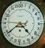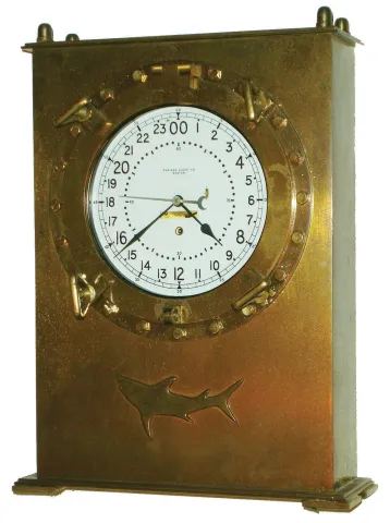 Chelsea Clock Co., Boston, 8" dial 8 day time only marine clock custom-mounted in brass porthole stand, c1965 this heavy case was skillfully fabricated from an old porthole and pieces of sheet brass that were lacquered and now flaking a bit. The plywood back removes quickly for access to movement number 687888 which ticks. The painted metal dial has a few small blemishes and a rectangular cutout before the center shaft. The front round glass is absent. Ht 20"