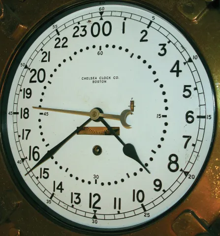 Chelsea Clock Co., Boston, 8" dial 8 day time only marine clock custom-mounted in brass porthole stand, c1965