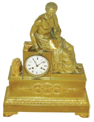 France, large gilt bronze mantel clock, seated male figure with scrolls and laurel wreath above an acanthus molded base on Grecian scrolled feet, front with interlocking wreaths, two of which contain lightning, and with a spear behind, beaded bezel with beveled glass, Roman numeral white enamel dial with blued steel hands, 8 day time and count wheel strike pendule a Paris movement signed "Pons", pendulum with silk thread suspension, case back also with glazed bezel, c1840 the gilding which remains is very good, but areas without gilding have likely been stripped of their original colored patination, case dirty and with polish residue, dial with minor flakes and hairlines, small paper shim visible at 6:00, hands correct, minute repaired, both hands with minor rust, bezels and glasses good, movement dirty, ticks and strikes, would benefit from service, pendulum replaced, Ht 22"