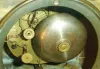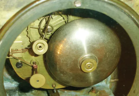 the gilding which remains is very good, but areas without gilding have likely been stripped of their original colored patination, case dirty and with polish residue, dial with minor flakes and hairlines, small paper shim visible at 6:00, hands correct, minute repaired, both hands with minor rust, bezels and glasses good, movement dirty, ticks and strikes, would benefit from service, pendulum replaced, Ht 22"