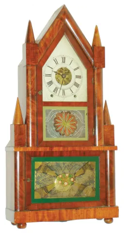 Birge & Fuller, Bristol, Conn., 8 day, time and strike wagon spring steeple on frame or double steeple shelf clock, c1845 Mahogany veneered case in an old and possibly original finish with some small veneer chips on the base and a piece missing the side. Original painted dial has some loss at the mounting screws and a thin area between 4 and 7 o'clock. The top finials may have been altered to compensate for broken tips or they are later replacements. Both tablets look to be original. Hands are original. Movement is signed. Nice label inside the case. Ht 27.5"
