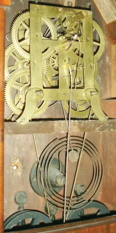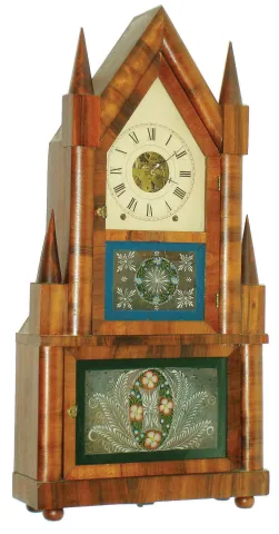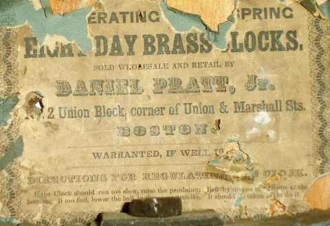 Birge and Fuller, Bristol, Conn., retailed by Daniel Pratt, Jr., Boston, 8 day, wagon spring time and strike steeple on frame or double steeple clock, c1845.