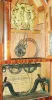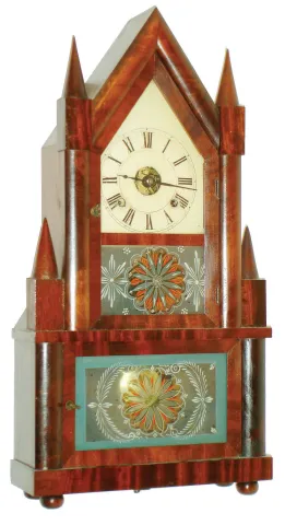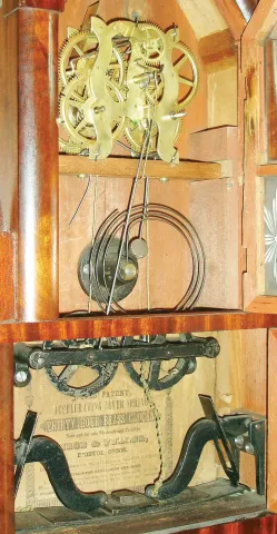 Mahogany veneered case in an old and possibly original finish. There is a small veneer repair to the two upper finial blocks and small chip on the back edge of the top. The bottom steeple finials might be possible replacements. The original painted dial is has some minor loss at the mounting pins, the winding arbors and at the center hole. The tablets look to be original. Hands are original. Nice label inside the case. The chain for the strike side is detached from from the spring lever. Although a catalog item by 1855, very few 30-hour wagon springs were sold, and they are uncommon. Ht 24"