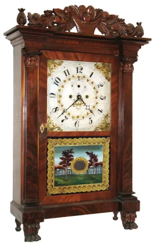 Mahogany and mahogany veneered case in very nice condition in original finish with some small veneer repairs and a piece missing at the door lock. Original painted dial has age darkened a little, but is in otherwise nice condition. Hands are original. Seconds hand is missing. Tablet is a replacement. Pineapple finials are old, but probably not original. Original brass pulleys. Dark but readable label inside the case. A dust cover behind the carved crest to cover the pulleys is missing. Ht 34"