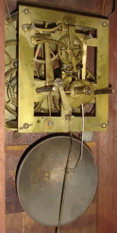 Lucius B. Bradley, Watertown, Conn., 8 day, time and strike weight Salem Bridge movement shelf clock, c1830 Mahogany and mahogany veneered case in very nice condition in original finish with some small veneer repairs and a piece missing at the door lock. Original painted dial has age darkened a little, but is in otherwise nice condition. Hands are original. Seconds hand is missing. Tablet is a replacement. Pineapple finials are old, but probably not original. Original brass pulleys. Dark but readable label inside the case. A dust cover behind the carved crest to cover the pulleys is missing. Ht 34"