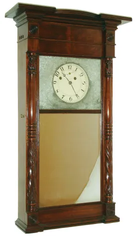 Asa Munger, Auburn, New York, 8 day, time and strike weight brass movement "Flat-Top" or "Ironing Board Top" carved half column and cornice top wall or shelf clock, c1830 Refinished Mahogany and mahogany veneered case in nice condition. Original dial surround has a little loss to the galvanized finish. Dial currently mounted to the movement appears to be original, but is now repainted. Another period dial in need of restoration is included. Nice clean label inside the case with remains of much of the original wall paper. Ht 39" From the collection of the late Rose Brandt.