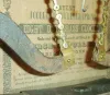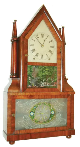 Birge & Fuller, Bristol, Conn., 8 day, time and strike wagon spring steeple on frame with candle finials or double steeple, c1845 Refinished mahogany veneered case in very nice condition with a couple of small chips on the hinge side of the bottom door and small repair to the molding near the top hinge of the top door. Original painted dial has some minor loss at the mounting pins. Both glasses are original with some loss to the upper tablet. Hands are replacements. The chain on the wagon spring section looks to be a replacement. The leaves that make up the wagon spring maybe a replacement as they look to have been cut with a shear. Movement is signed. Ht 26"