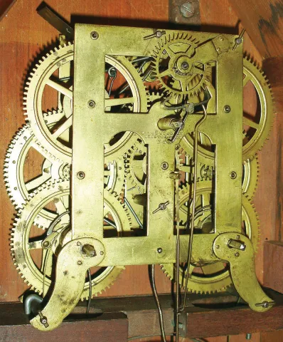 Birge & Fuller, Bristol, Conn., 8 day, time and strike wagon spring steeple on frame with candle finials or double steeple, c1845