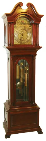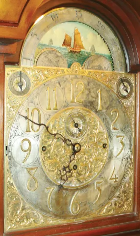 the case is in good condition and retains its original finish. The hood guides are partially absent. The silvered chapter ring is darkened. The movement needs service. This is a high quality English made movement by the renowned maker J.J. Elliot. Ht 91 1/2"