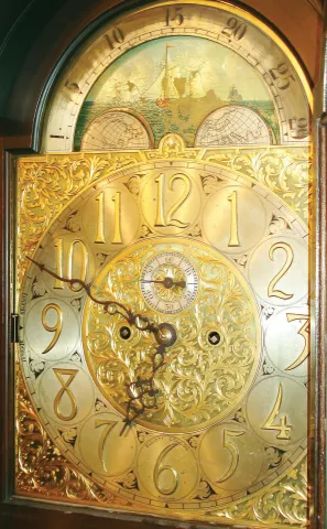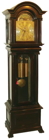 J.J. Elliot, London, England, tall clock, 8 days, time and strike on tube, weight driven movement in a mahogany case with paw feet, fully turned Corinthian columns flanking trunk door, beveled glasses and arch top with silvered chapter ring and moon phase in arch, brass numerals and heavy cutout fancy brass spandrels on corners and center, c1900 the clock is in very good original condition with minor wear to the paws and lower left front side of hood. The hammer and tube need to be reattached properly. The moon phase dial has 50% loss. Ht 90"