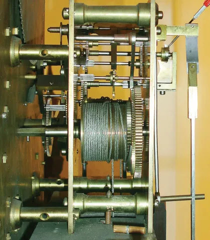 the clock is in very good original condition with minor wear to the paws and lower left front side of hood. The hammer and tube need to be reattached properly. The moon phase dial has 50% loss. Ht 90"