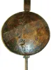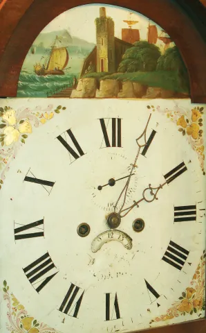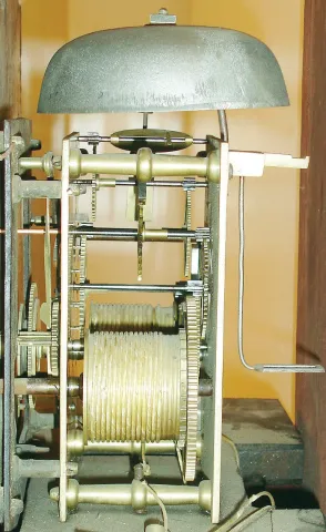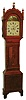 the case has an old finish. The cross hatched inlay surrounds the crotch mahogany veneer on trunk door and plinth. The trunk door is slightly warped and there is some veneer lifting. The finials are replacements. The dial is in very good condition, but the maker's signature is illegible and the pendulum iron bob is period and nicely painted. Ht 88"